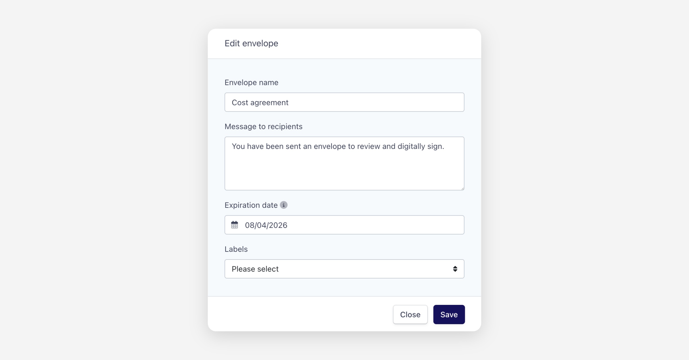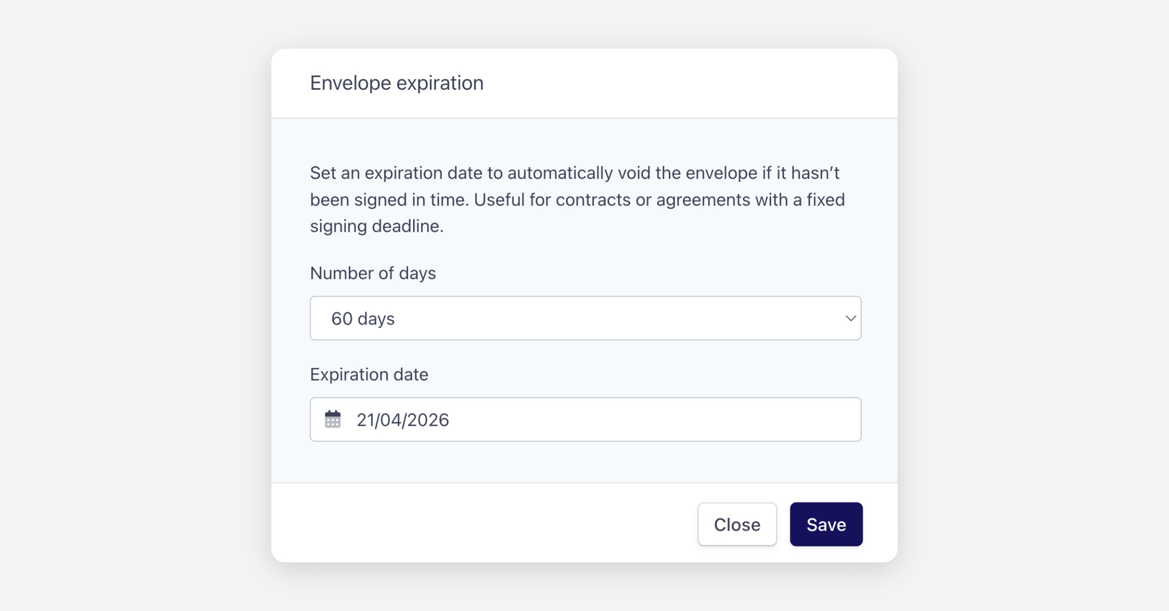 Setting an expiration date on an envelope is useful when you have a contract, quote or agreement that must be signed by a specific deadline. If an envelope isn’t completed by that date, we automatically void it so no signatures can be added afterwards. This helps you make sure documents are actioned on time and reduces the risk of stale or ambiguous agreements.