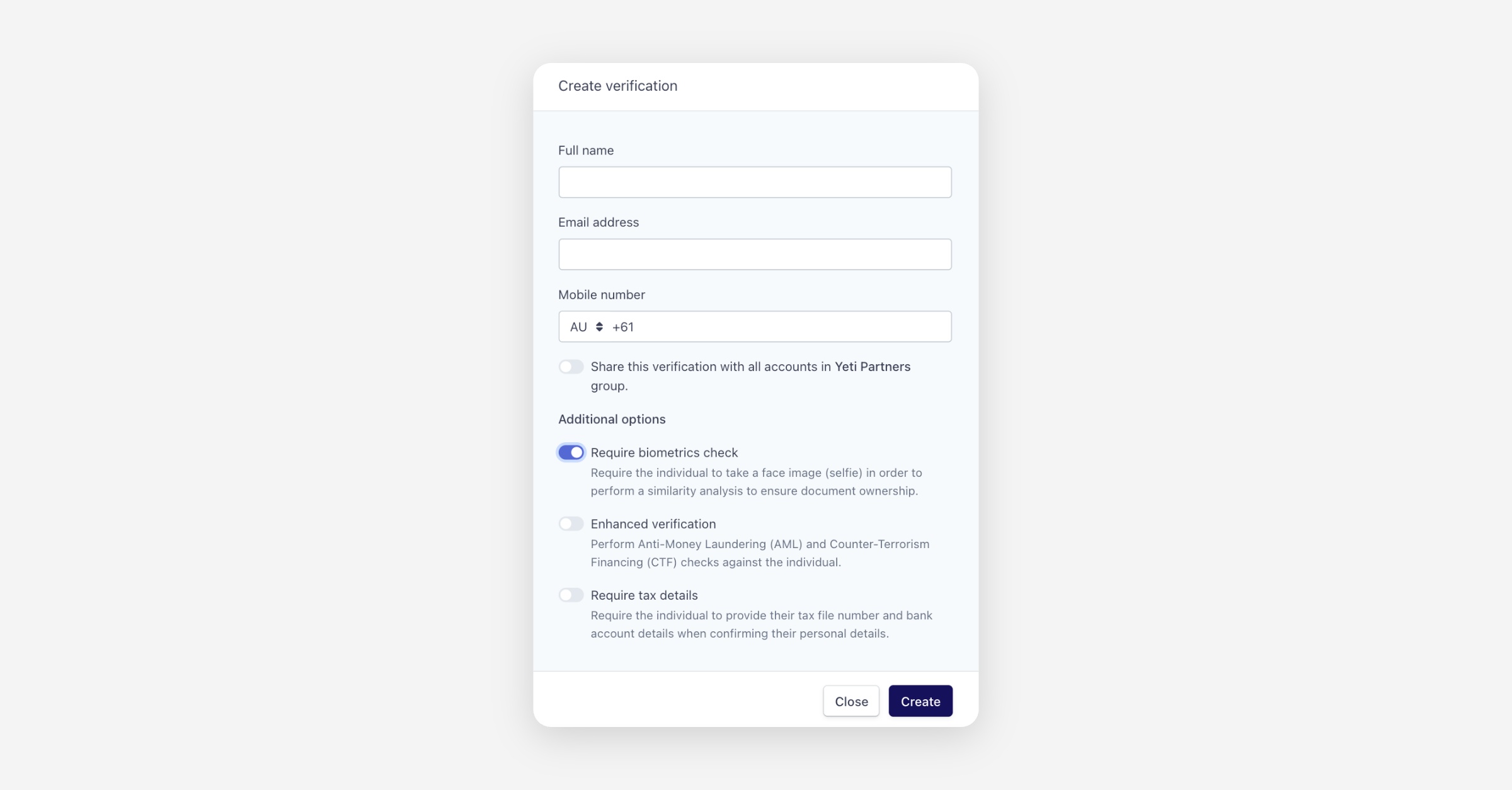 When creating an identity verification request, you can require your client to complete a biometrics check. This process compares a selfie taken by your client with the photo on their identity document (licence or passport), ensuring that the person completing the verification is the same person pictured on the document.