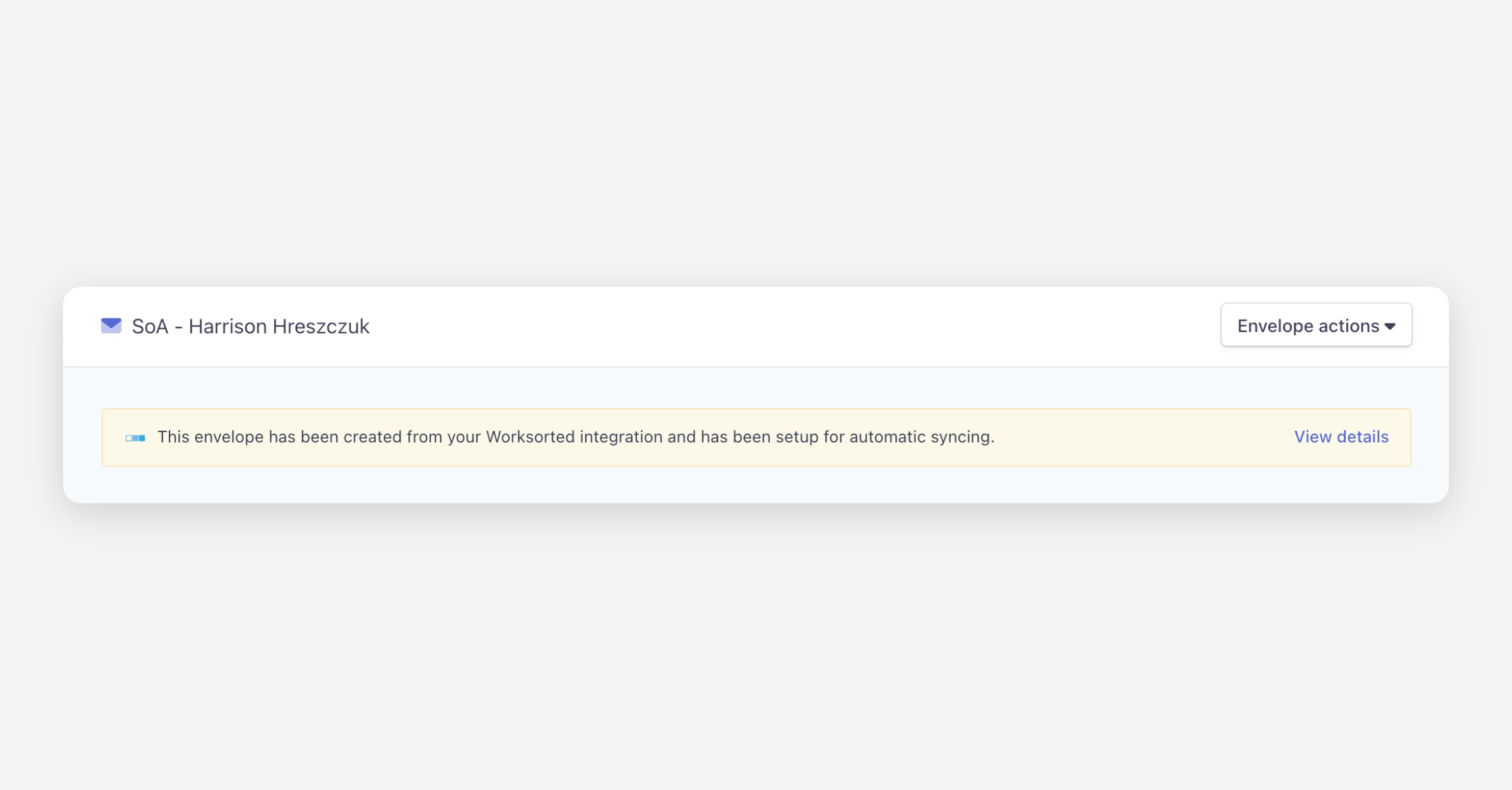 Envelopes created via the Worksorted dashboard display a banner with a View details option. This shows the client ID, a link to open the contact in Worksorted, document details, and the current sync status.