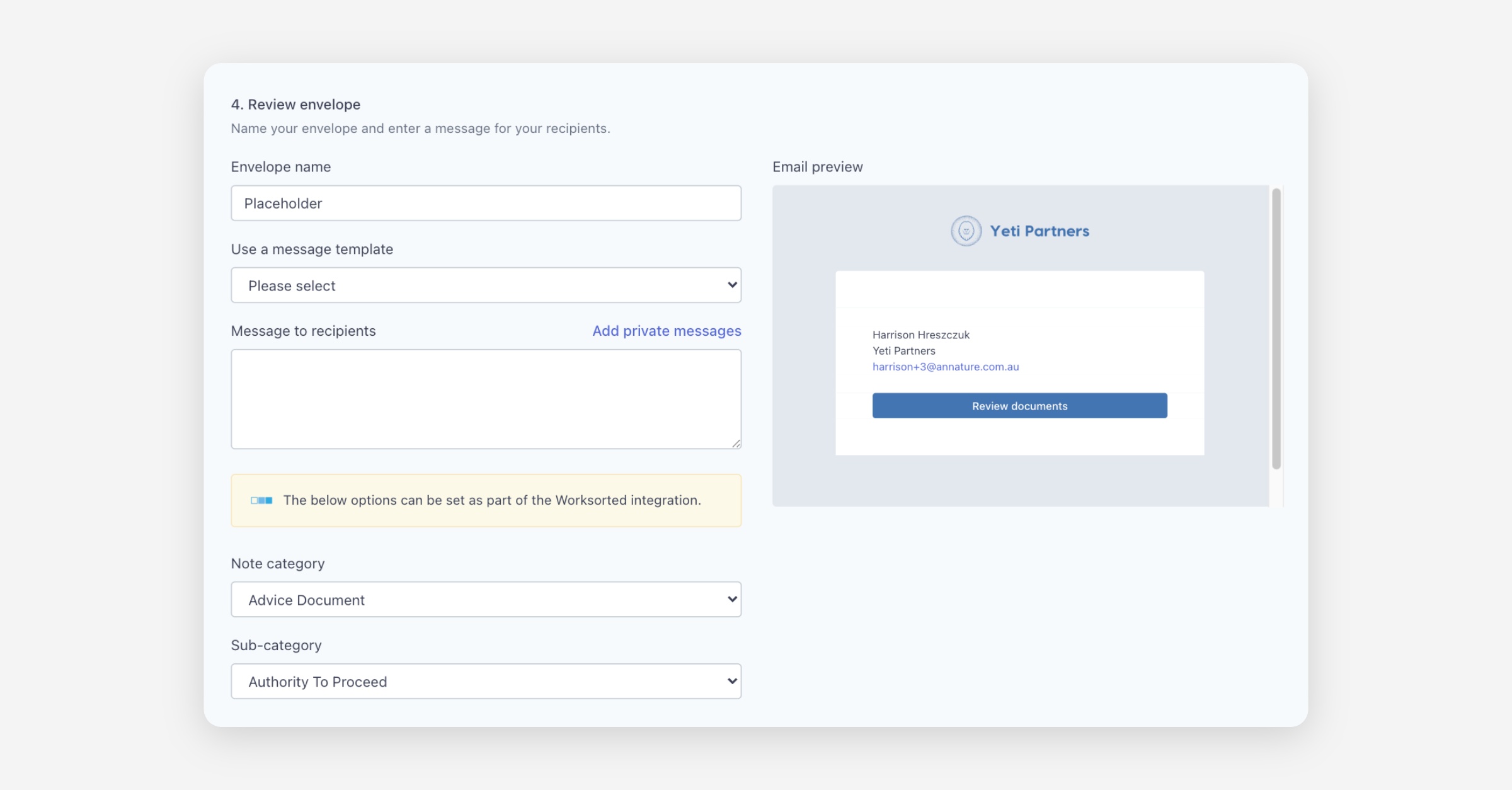 In the Review envelope section, select the Worksorted note category and sub-category.