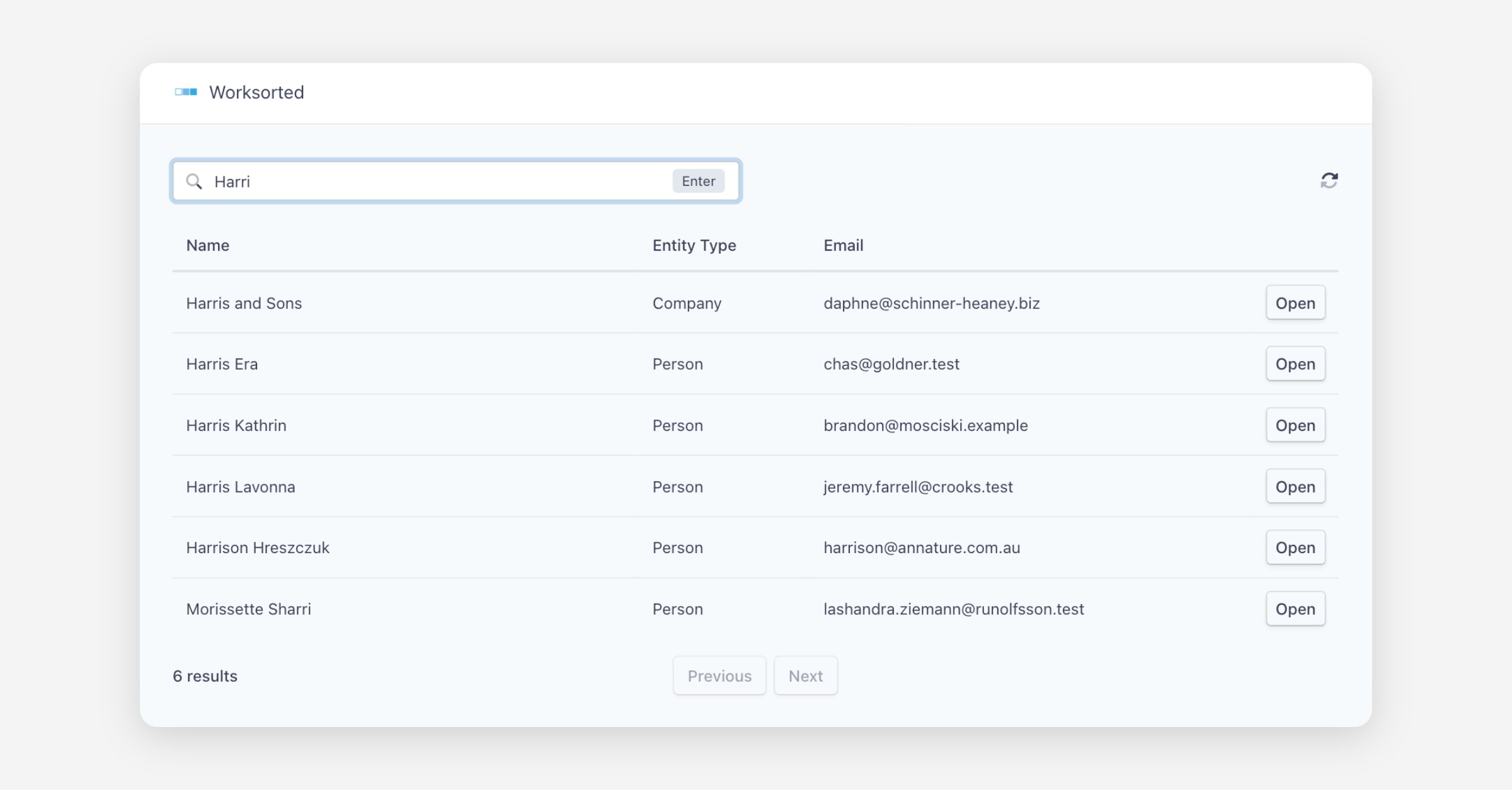Click Open beside the client you want to send an envelope to. You'll see their basic details synced from Worksorted, with the option to open the contact directly in your CRM.