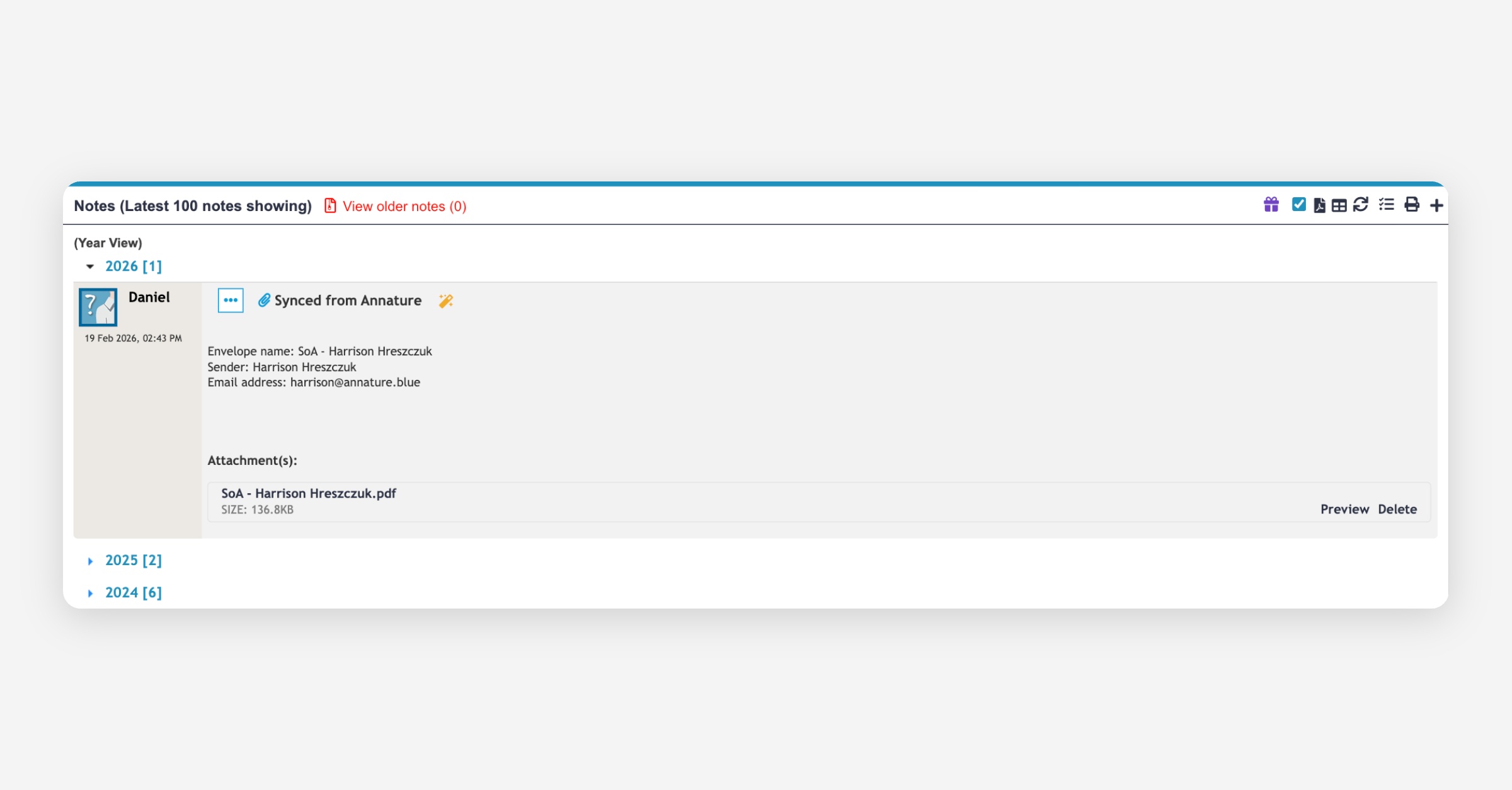 When an envelope created via the Worksorted integration is completed, it is added as a note against the contact in Worksorted. You can preview and download it directly from within Worksorted.