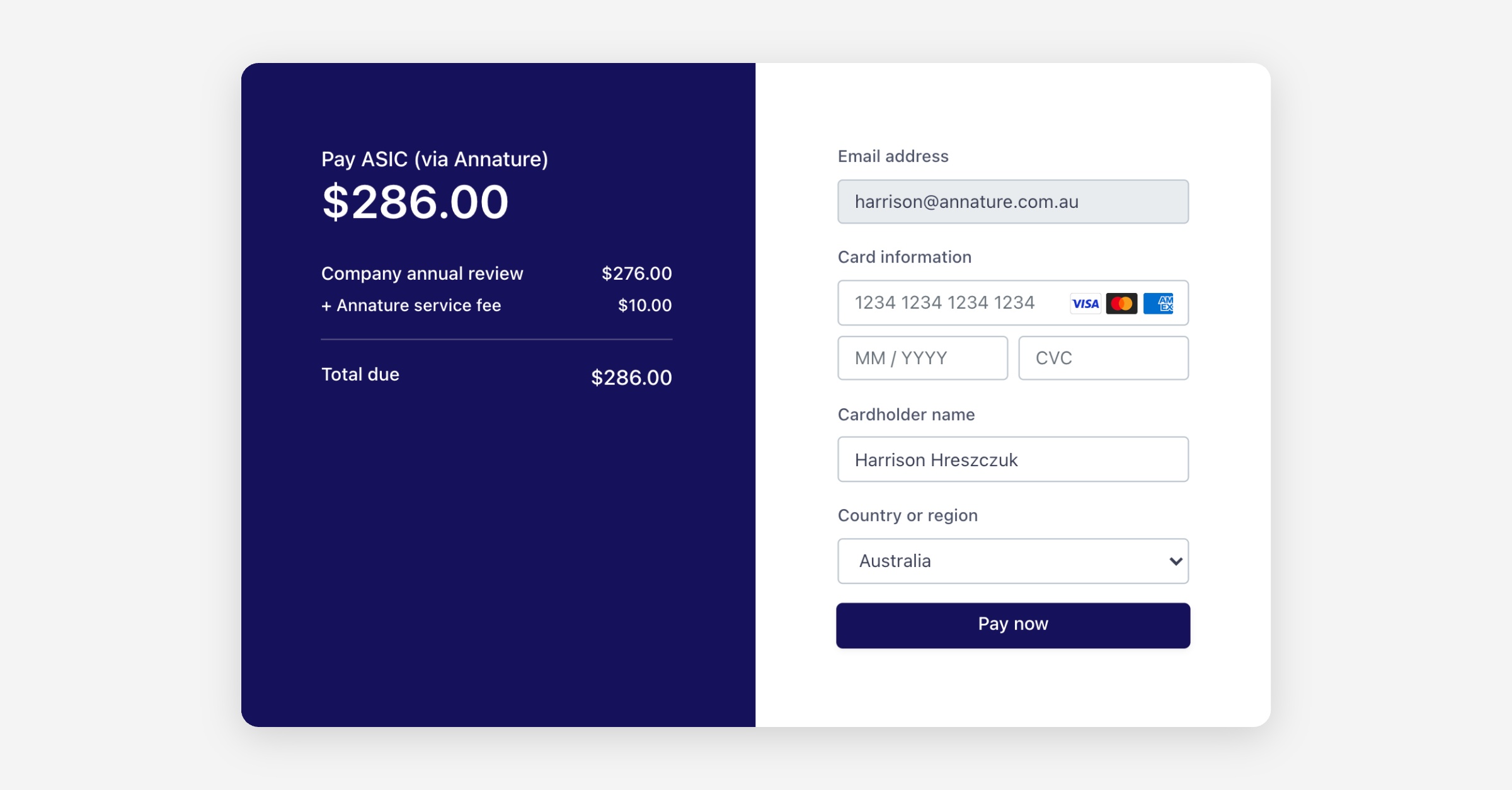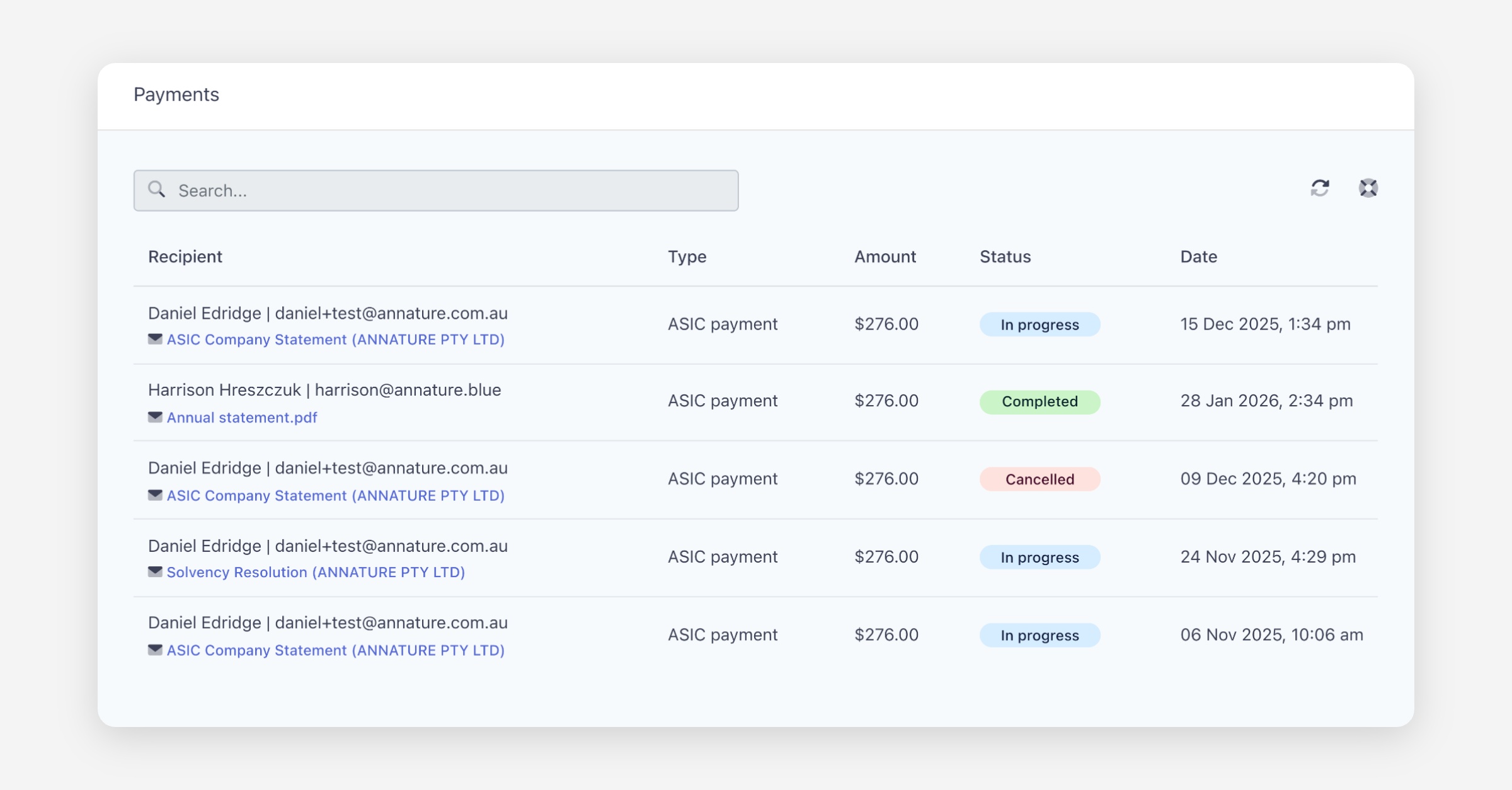 With Annature, the entire process is simplified into one seamless flow. Instead of chasing payments separately, you can send the ASIC annual statement as part of an envelope. The client reviews the statement, confirms their details, and securely provides payment in the same sitting. Payments are processed instantly, removing the need to manually collect or reconcile funds.