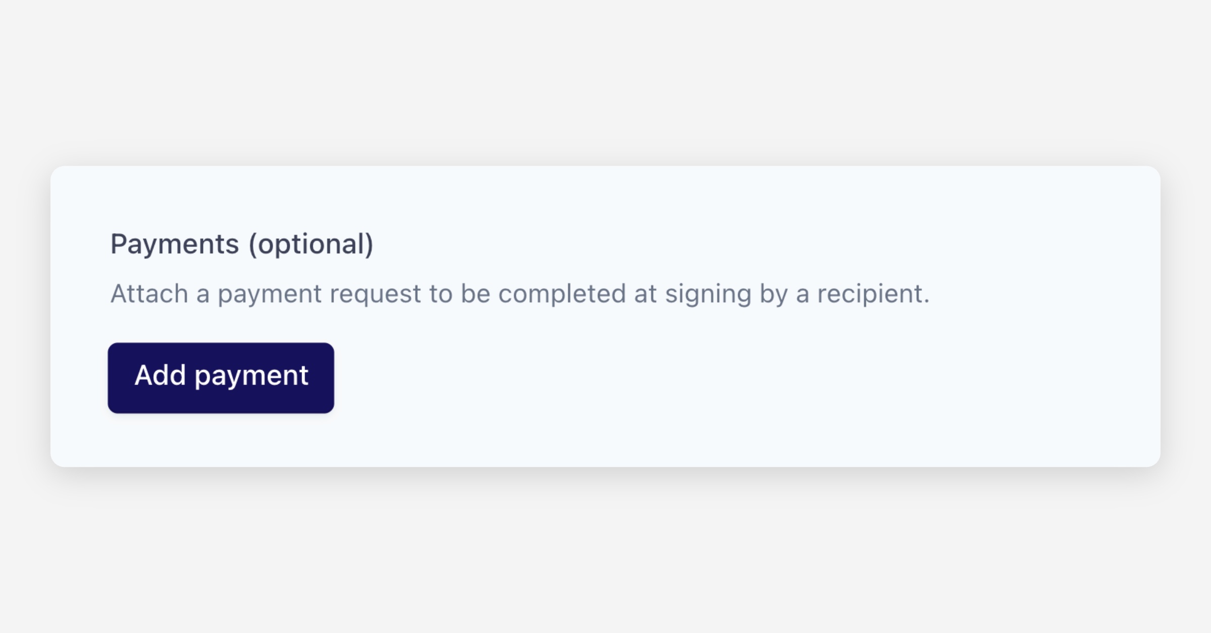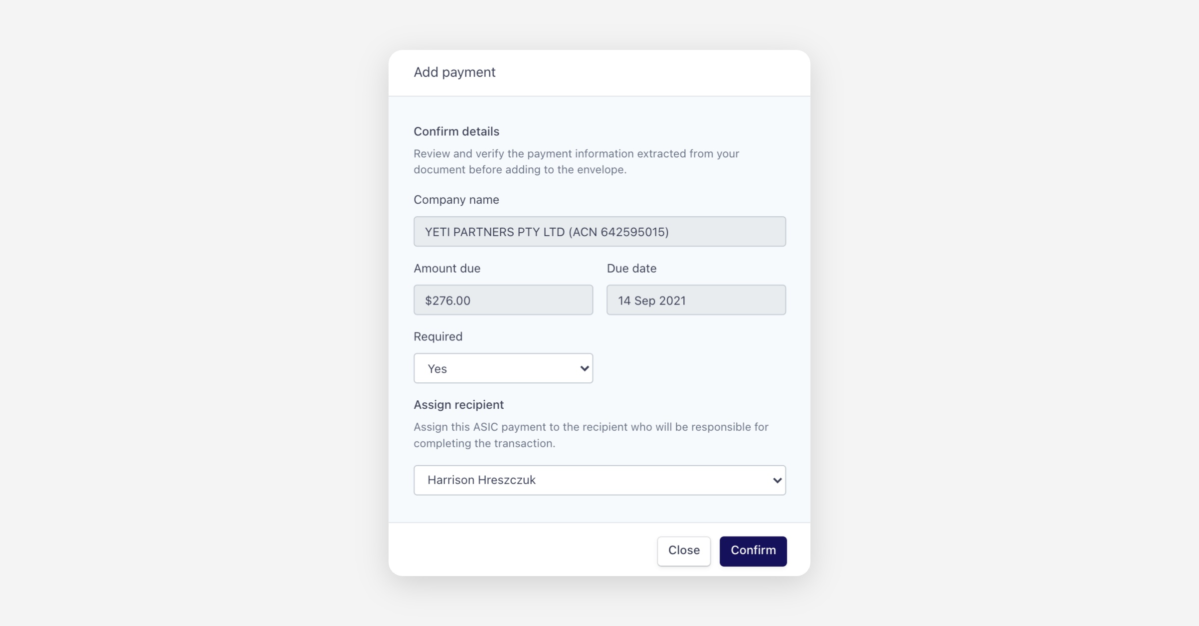 Your organisation must complete the Payments Registration process before ASIC Payments become available. Once approved, ASIC Payment will appear as an option whenever you add a payment to an envelope. Learn more here.