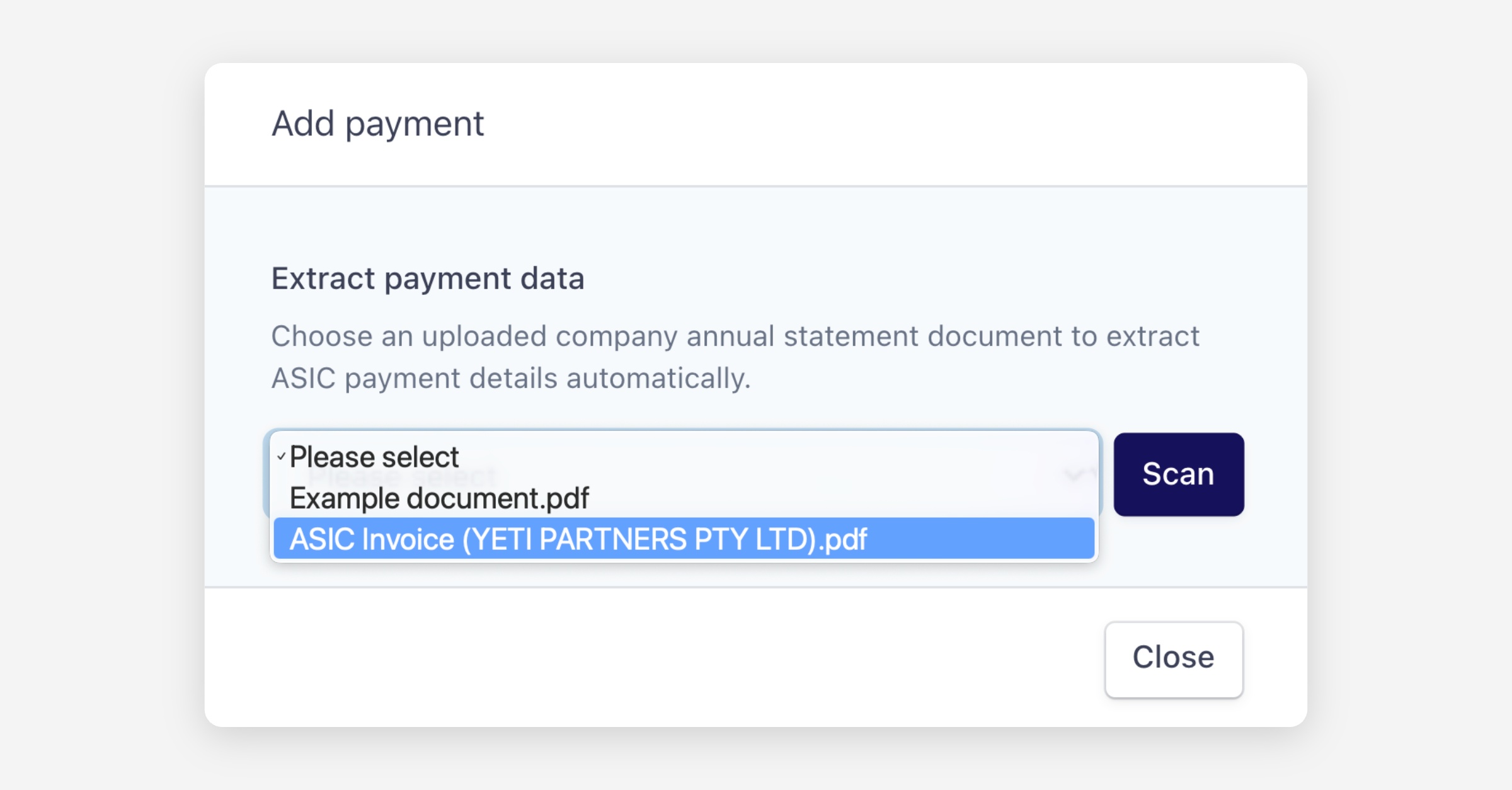 Select which document contains the ASIC invoice and run a scan. Annature uses OCR to automatically extract the payment amount from the document.