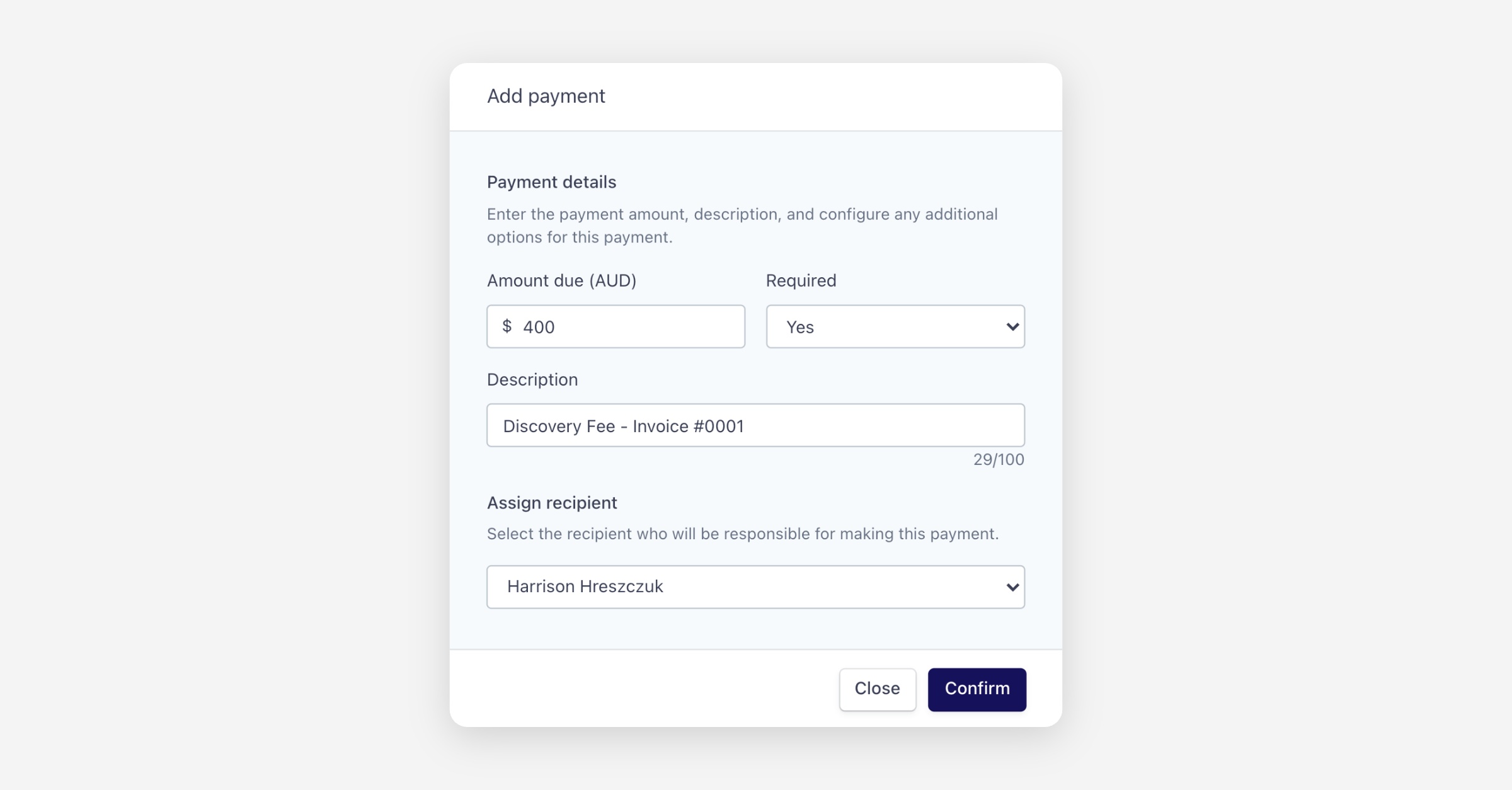 Description — What the payment is for (e.g. "Discovery Fee - Invoice #0001").