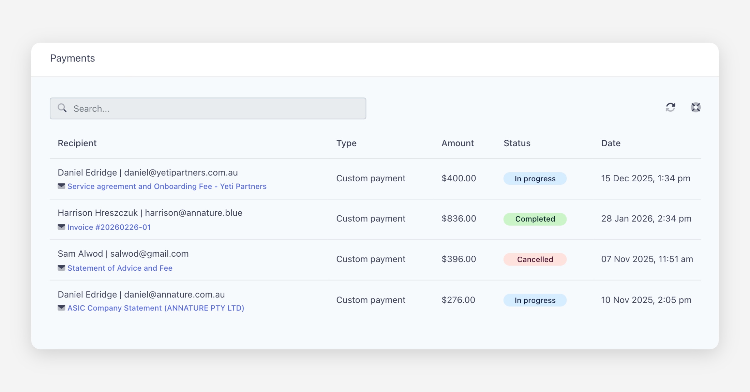 The Payments dashboard tracks all payment requests across your organisation, showing the recipient, associated envelope, payment type, amount, and current status.