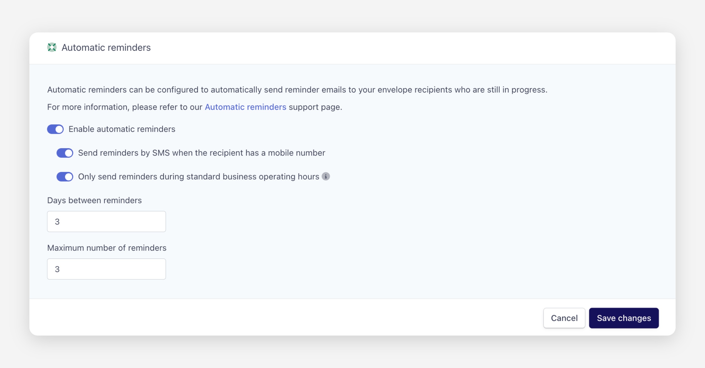 Automatic reminders help you nudge recipients to complete outstanding envelopes — without manual chasing. Administrators can choose how often reminders are sent and how many times they’re sent before stopping.
