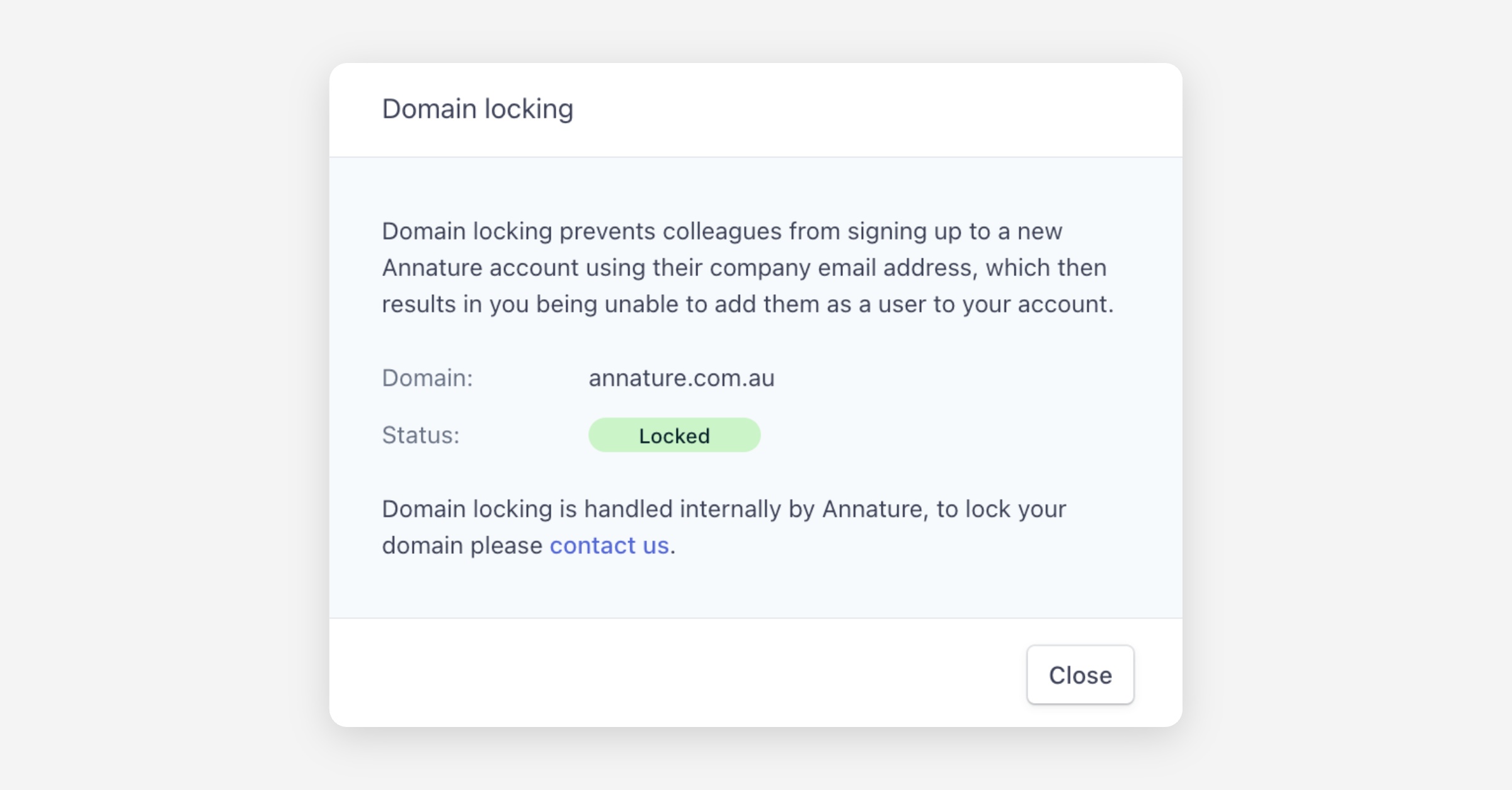 Because each email address can only be linked to one Annature account — and accounts cannot be merged — we offer domain locking to prevent duplicate or stray sign-ups.