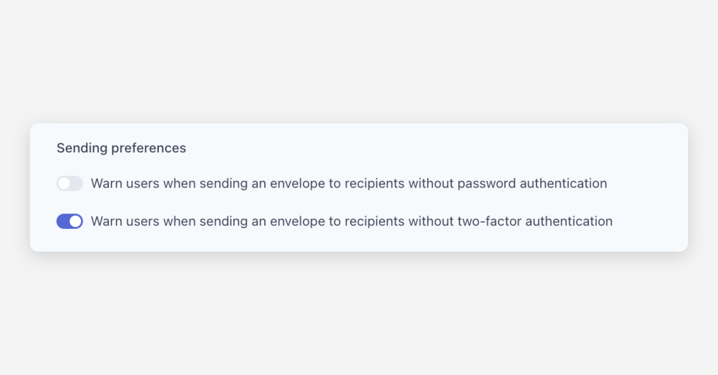 Warn users when sending an envelope to recipients without password authentication — When enabled, users will see a warning if they attempt to send an envelope where one or more recipients do not have password authentication configured.