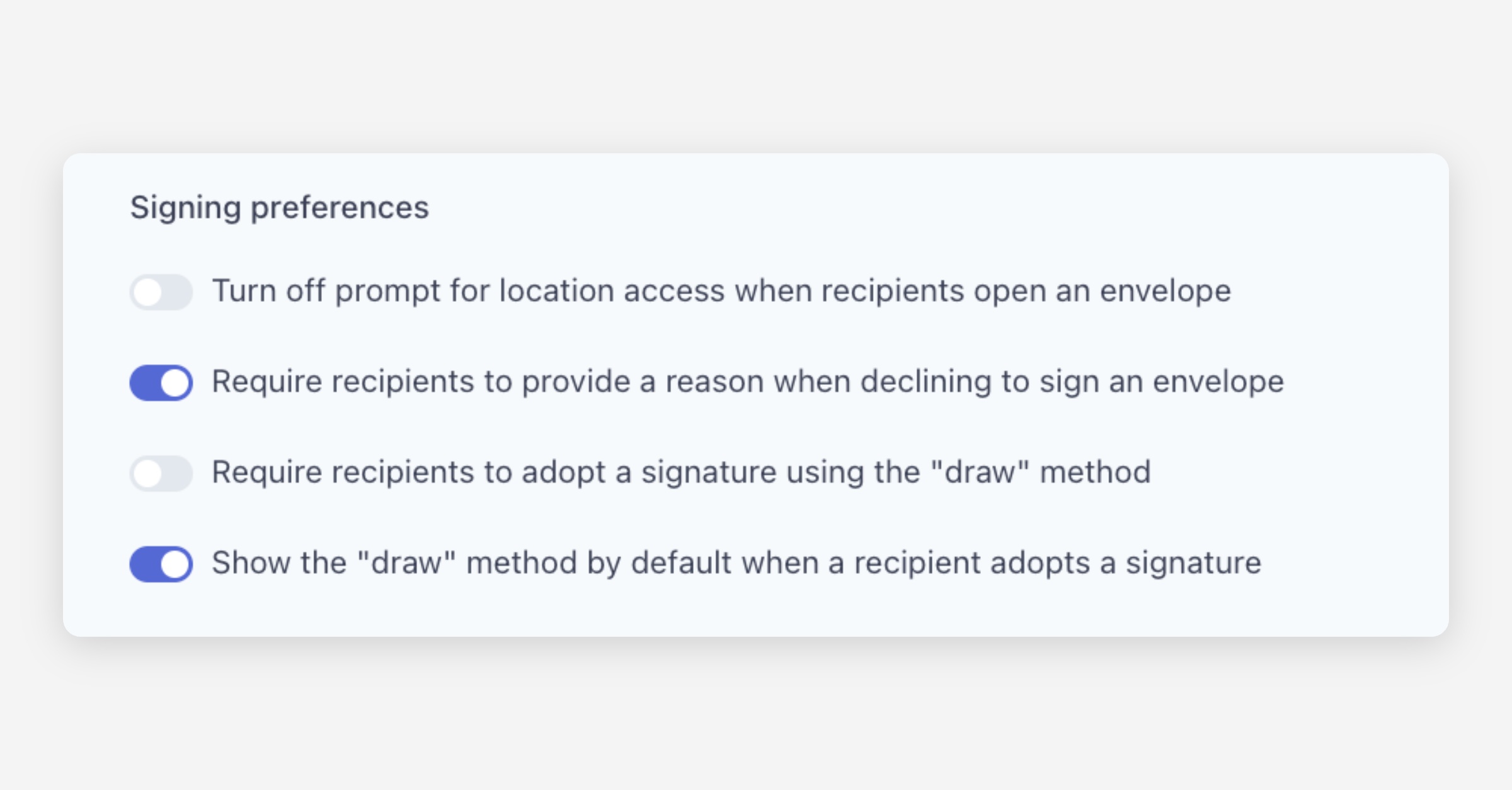 Require recipients to adopt a signature using the "draw" method — When enabled, recipients must draw their signature (using a mouse, trackpad, or touch screen) rather than using a typed or auto-generated signature.