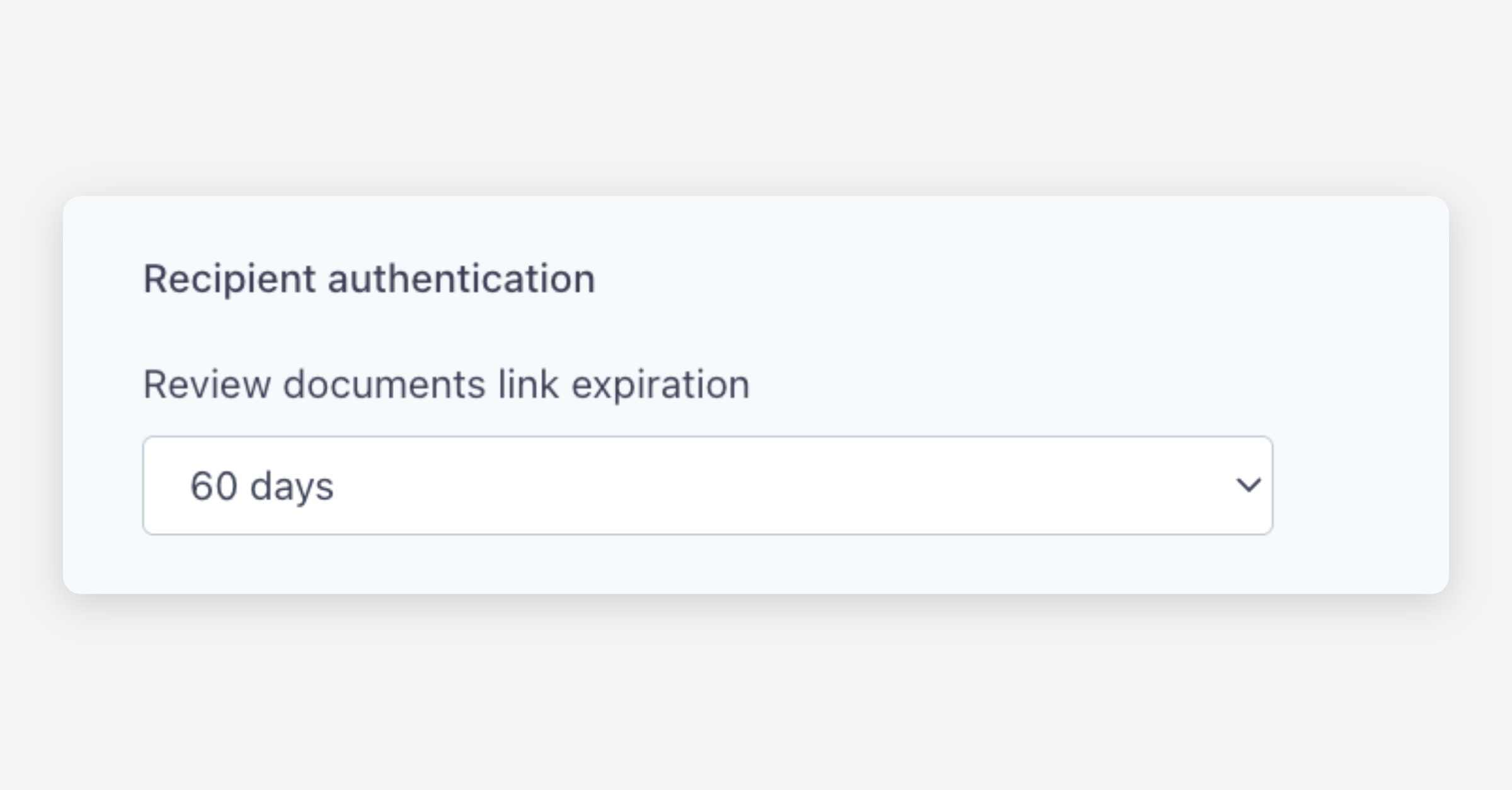 Review documents link expiration — Set how long the unique link sent to recipients remains valid. Options include 7 days, 14 days, 28 days, 60 days, or 90 days. After this period, the link will expire and the recipient will need a new link to access the envelope.