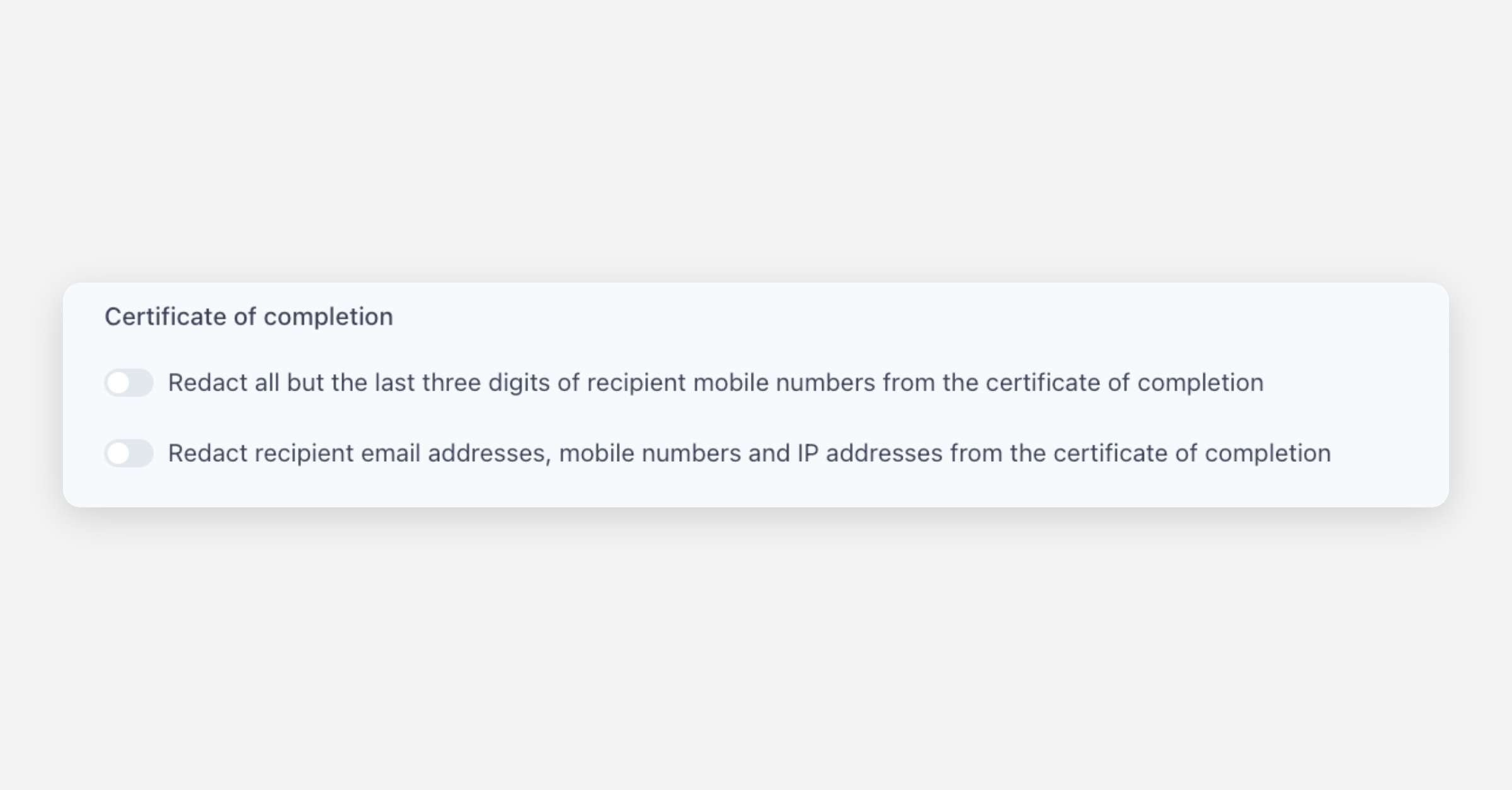 Redact recipient email addresses, mobile numbers and IP addresses from the certificate of completion — When enabled, all sensitive recipient information is removed from the certificate of completion entirely. Use this for maximum privacy.