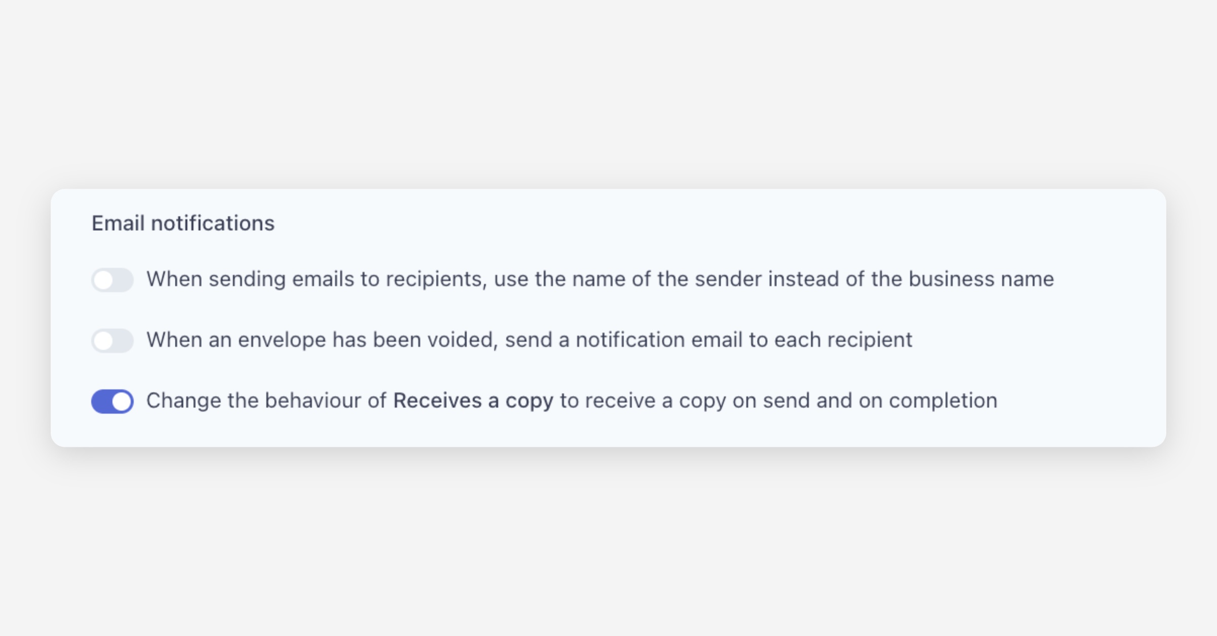 Change the behaviour of Receives a copy to receive a copy on send and on completion — By default, recipients marked as "Receives a copy" only receive the completed documents once the envelope is finished. When enabled, they will also receive a copy of the envelope when it is first sent, in addition to receiving the completed documents.