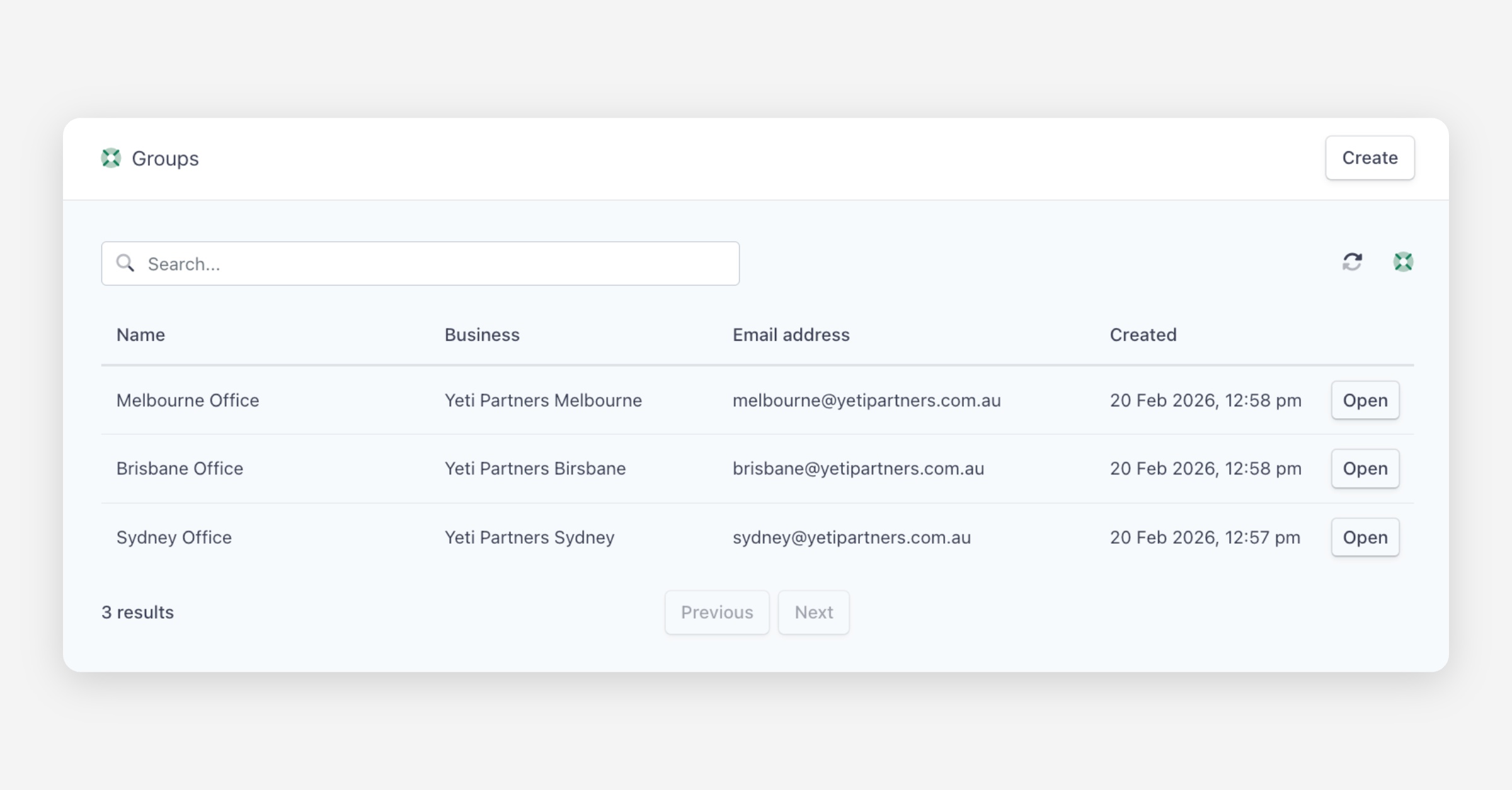 You can search for groups using the search bar at the top, and each group has an Open button to view or edit its details.