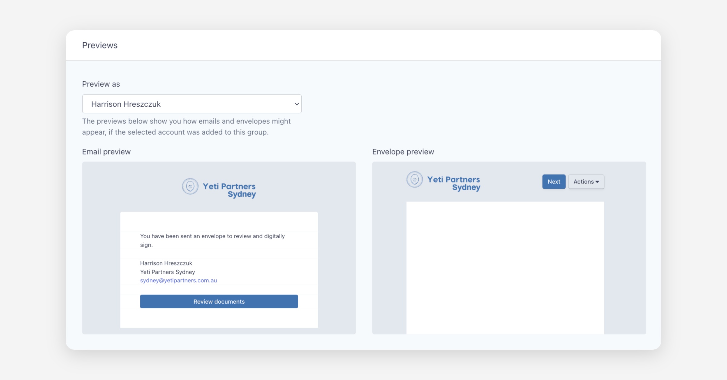 At the bottom of the group detail view, a Previews section lets you see how your group's branding will appear in practice. You can use the Preview as a dropdown to select a specific team member and see how emails and envelopes would look if that account was part of the group.