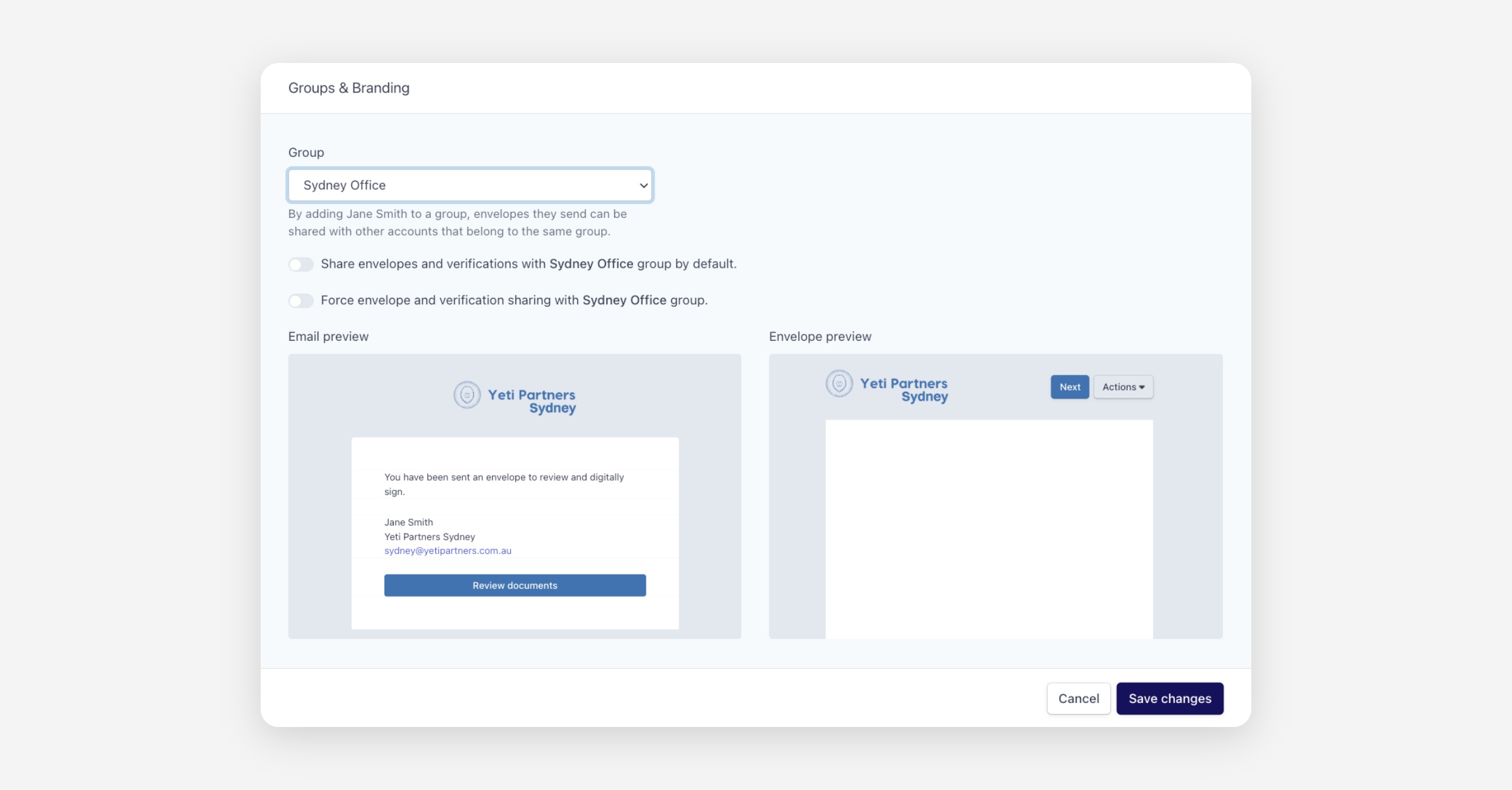 Envelope preview — Shows the signing experience header with the group's logo and branded button styling.