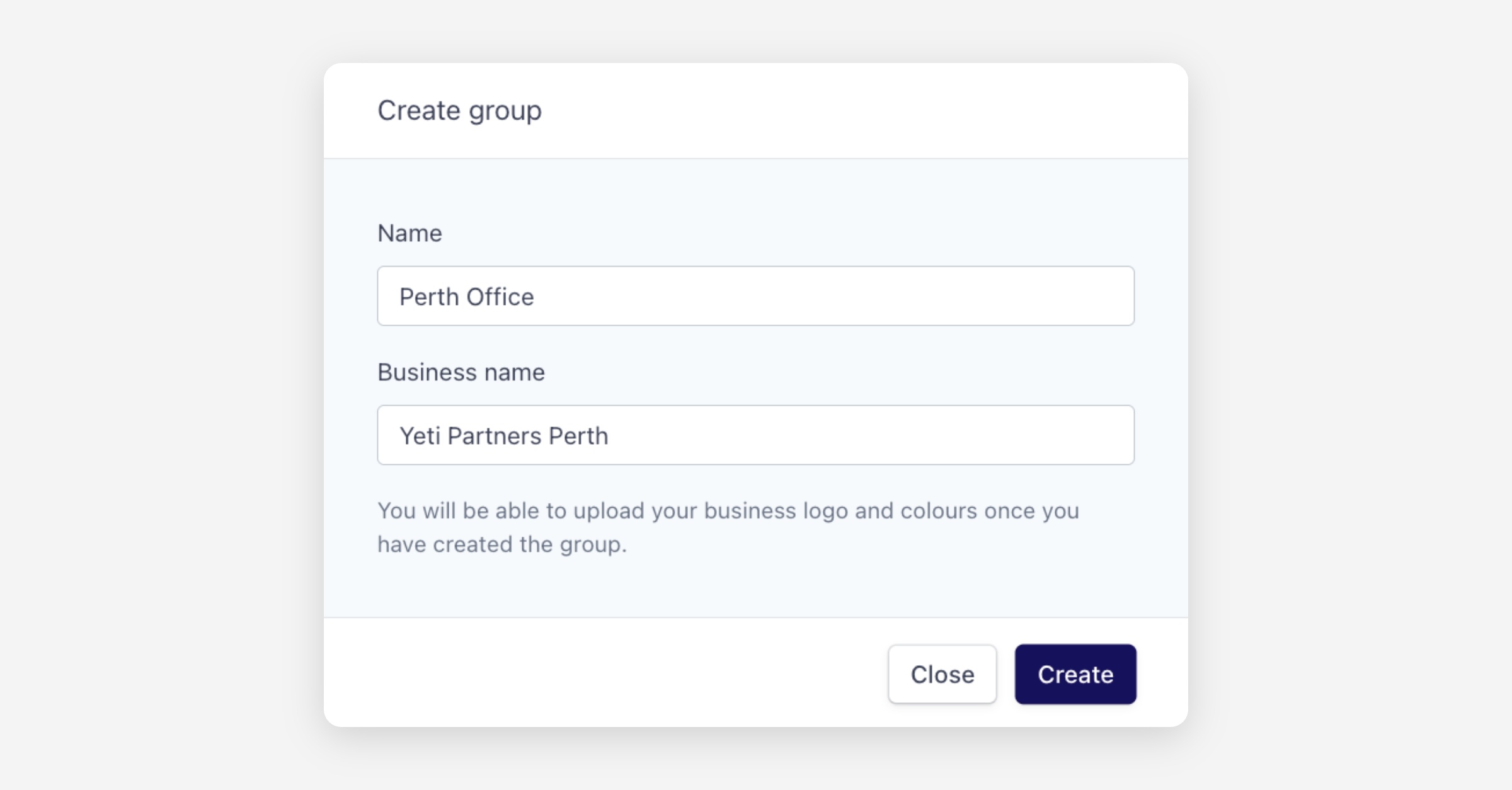 Click Create to save the new group. Once created, you can open the group to configure its full details, branding, and contact information.