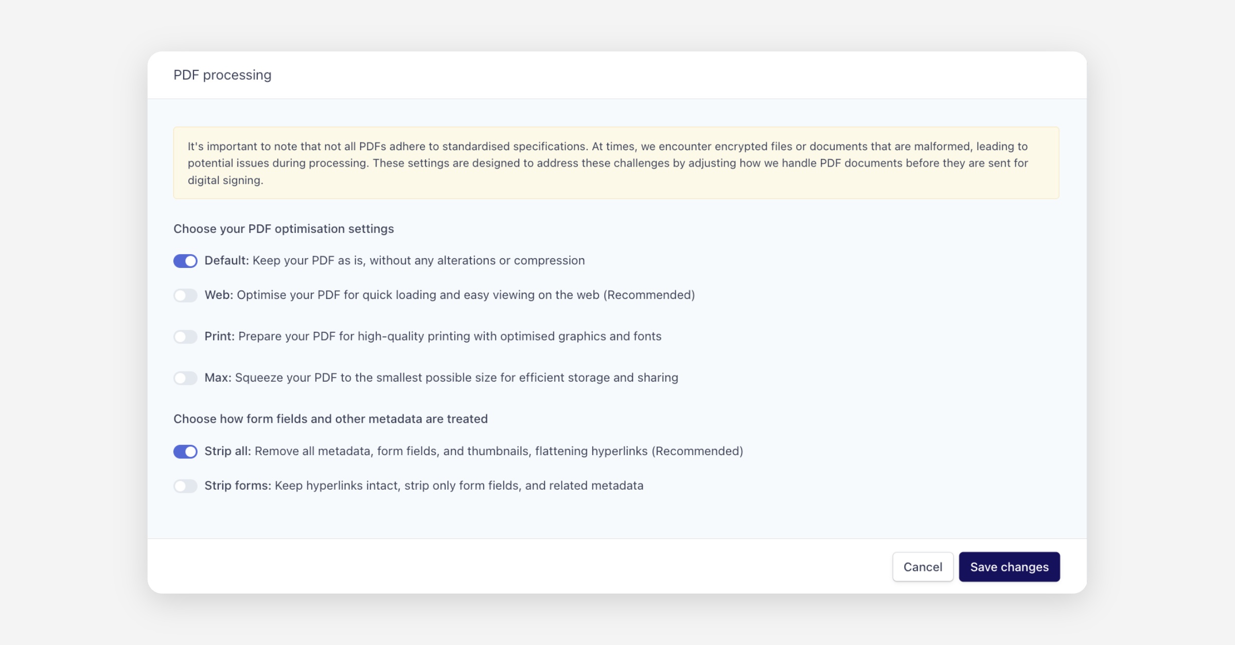 PDF Processing settings allow you to control how Annature handles PDF documents before they are sent for digital signing. Not all PDFs follow standard specifications. Some may be encrypted or malformed, which can cause issues during processing. These settings help address those challenges by adjusting how documents are optimised and prepared.