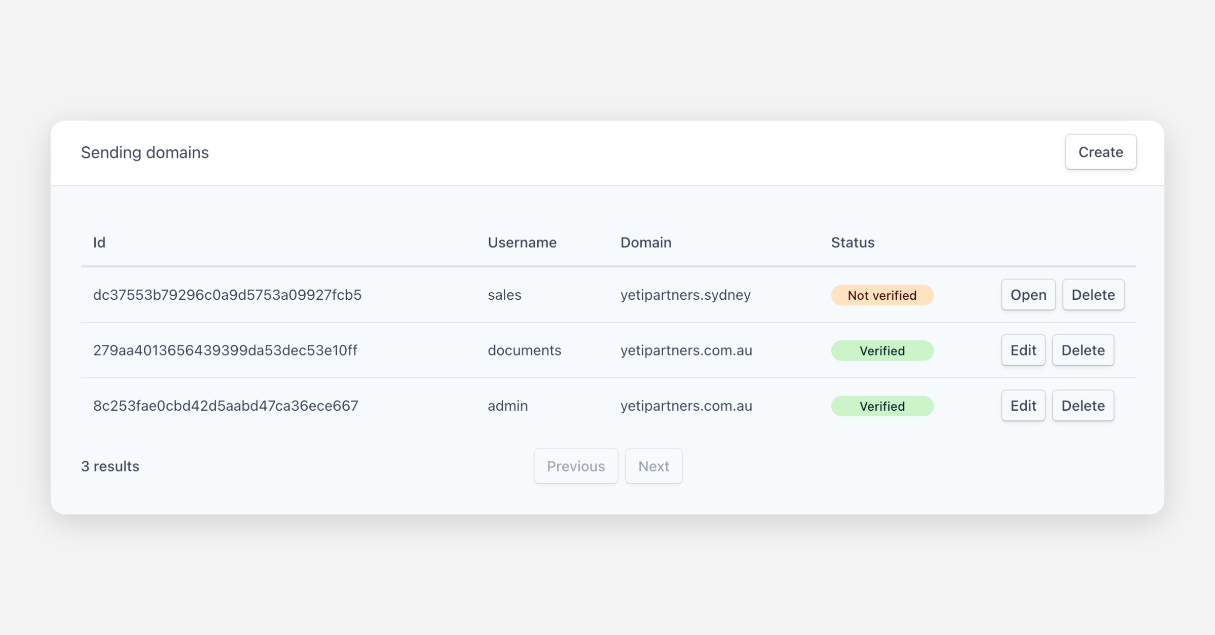 Verified domains have Edit and Delete buttons. Unverified domains have a open button to retry verification.