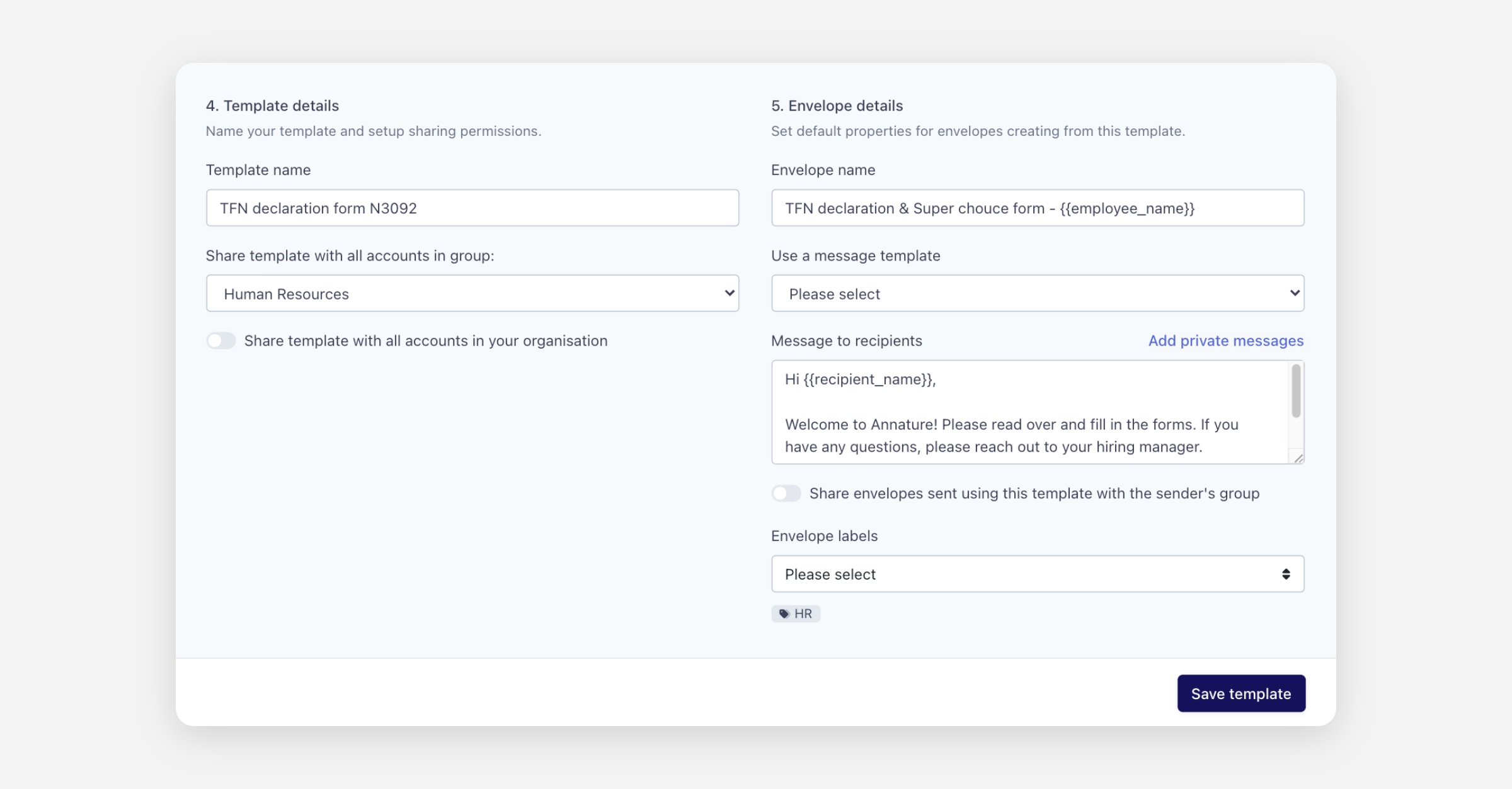 Envelope name — The default name for envelopes sent using this template. You can use placeholders based on role names (e.g. {{employee_name}}) to automatically include the recipient's name. The placeholder format is {{rolename_name}} where the role name is lowercase with no spaces.