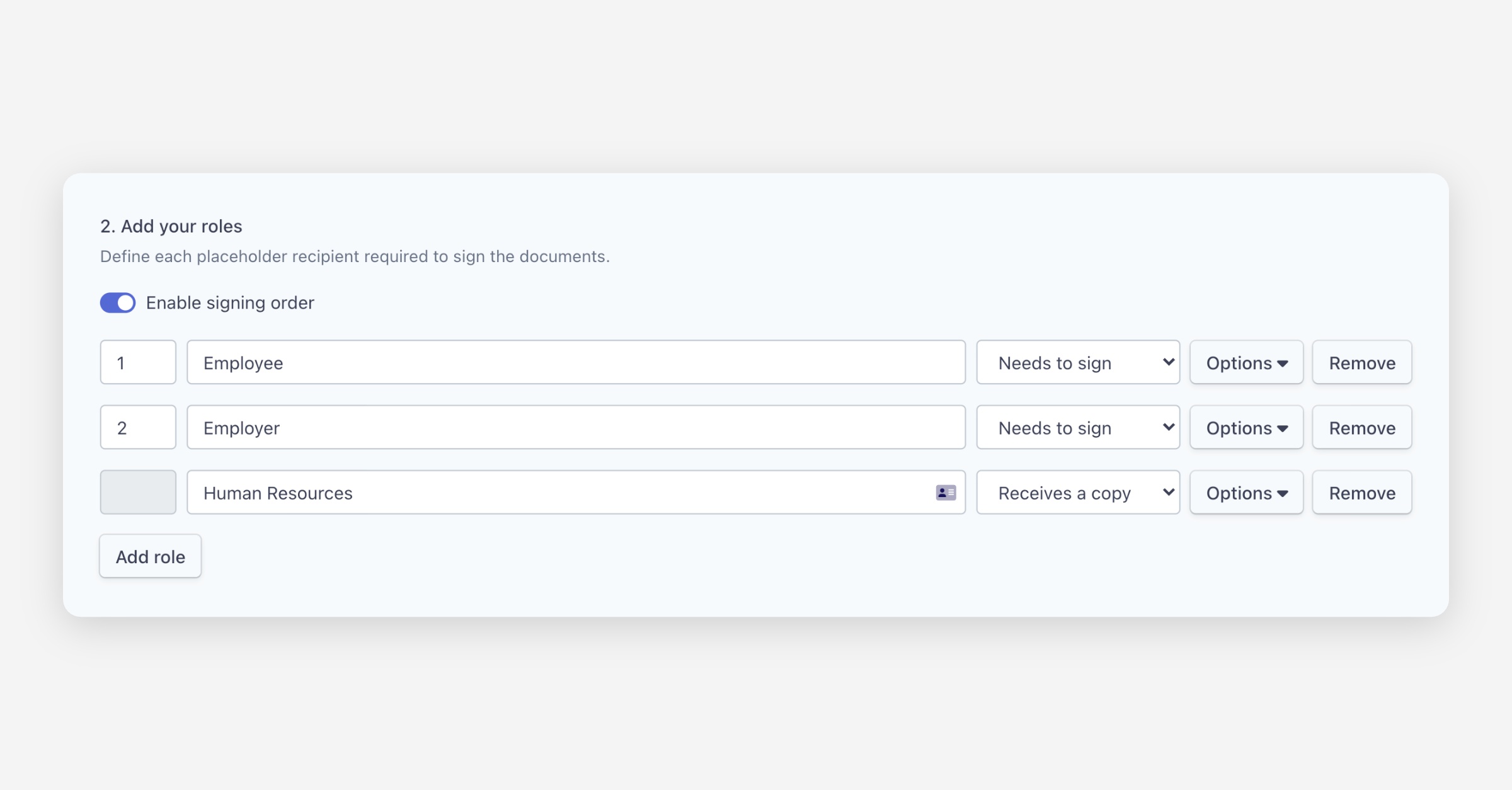 You can toggle on Enable signing order to define the sequence in which roles receive the envelope.
